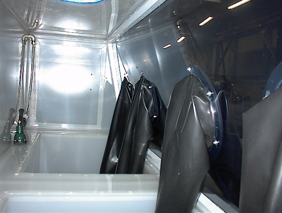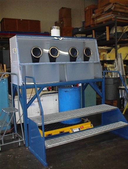 This washing station has protective gloves and plastic shielding to protect the customer's employees while treating parts in an acidic bath. |